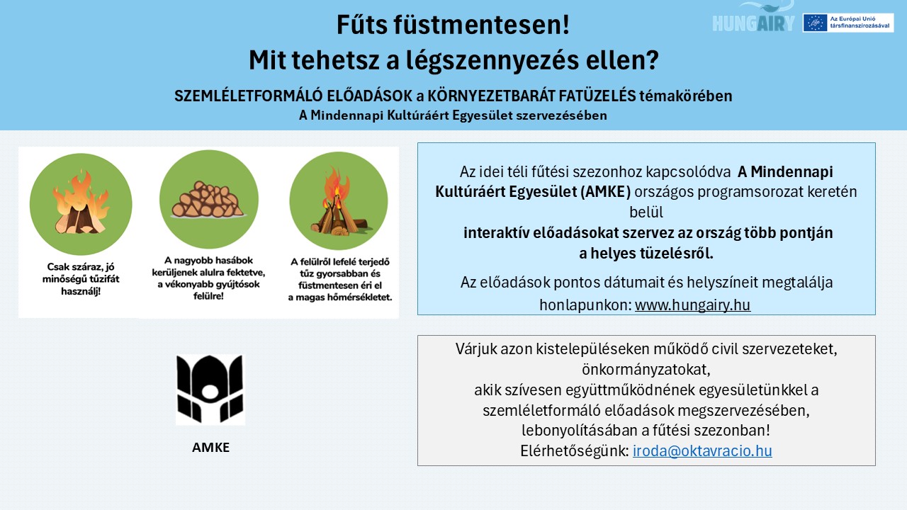 A Mindennapi Kultúráért Egyesület (AMKE) az idei fűtési szezonban országszerte interaktív, tájékoztató napokat szervez a lakosság körében, hogy felhívja a figyelmet a szilárd tüzelőanyagokkal történő fűtés környezetbarát és biztonságos módjaira. A szemléletformáló alkalmak a HungAIRy LIFE integrált projekt keretében valósulnak meg, melynek egyik fő célkitűzése a lakossági eredetű légszennyezés csökkentése.