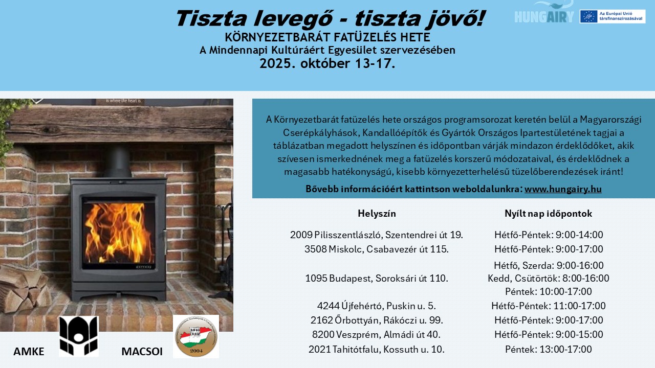 Az AMKE a LIFE IP HungAIRy projekt keretében harmadik éve rendezi meg a Környezetbarát fatüzelés hetét, idén 2025. október 13-17. között.